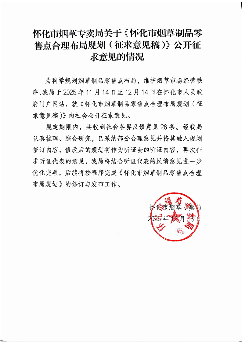 關(guān)于《懷化市煙草制品零售點(diǎn)合理布局規(guī)劃(征求意見稿)》公開征求意見的情況