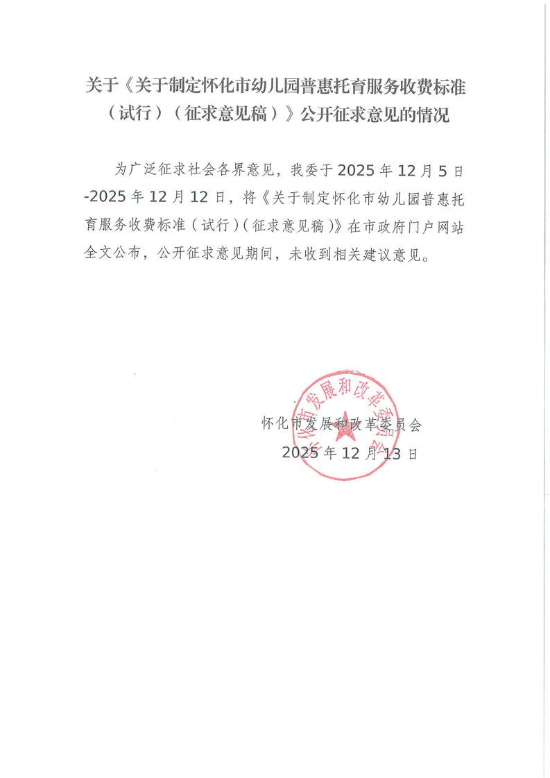 關(guān)于《關(guān)于制定懷化市幼兒園普惠托育服務(wù)收費(fèi)標(biāo)準(zhǔn)(試行)(征求意見稿)》公開征求意見的情況