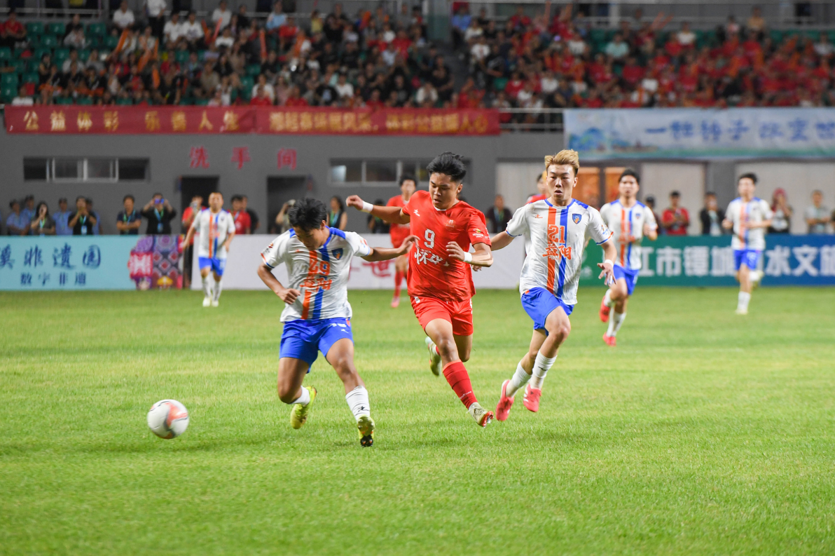 19時(shí)38分,隨著主裁判一聲哨響,比賽正式打響。上半場益陽隊(duì)率先破門,取得1∶0領(lǐng)先優(yōu)勢。下半場,落后的懷化隊(duì)調(diào)整戰(zhàn)術(shù)、頑強(qiáng)進(jìn)攻,終于在傷停補(bǔ)時(shí)階段打入湘超首個(gè)進(jìn)球,1∶1絕平益陽隊(duì)。