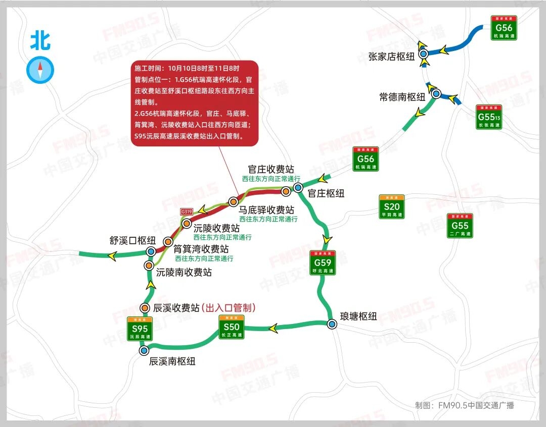 1.G56杭瑞高速懷化段,官莊收費(fèi)站至舒溪口樞紐路段東往西方向主線(xiàn)管制。
