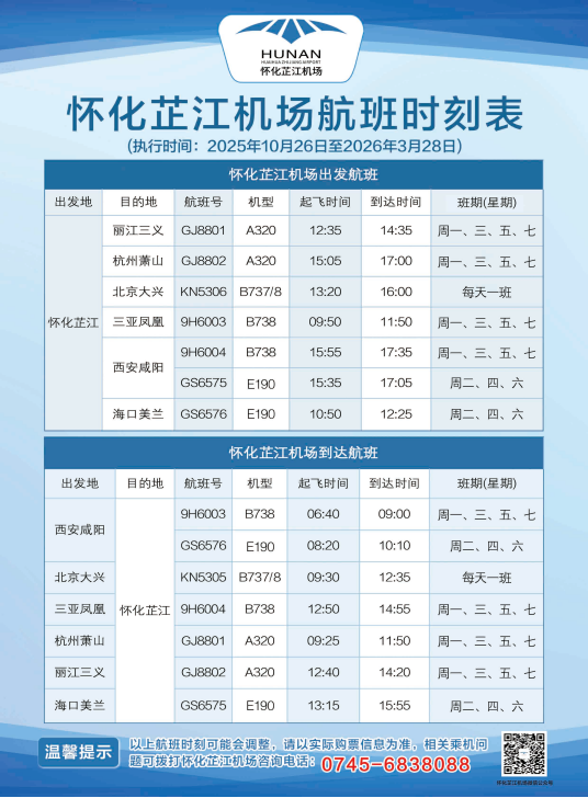 此外,提醒各位旅客,航班信息可能會變化,請以實(shí)際購票信息為準(zhǔn),如遇到相關(guān)乘機(jī)問題,歡迎撥打懷化芷江機(jī)場咨詢電話:0745-6838088。